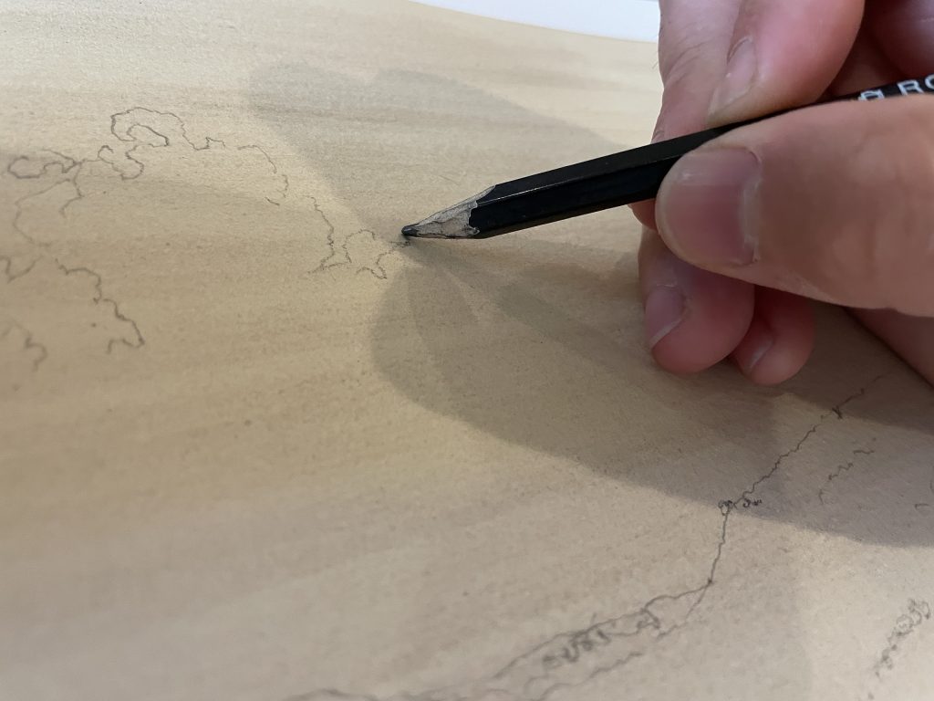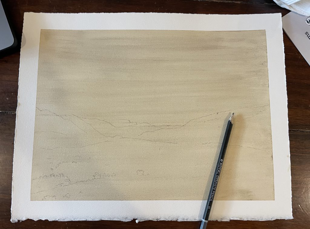 Working from a the photo I took, I pencil in the outlines of the landscape with an H-hardness pencil… H is a nice pencil hardness to work with, but anything in that range – HB, 2B, 2H, etc is fine to work with… you just want something that won’t smear (softness) and something that isn’t too light (hardness) to work over when you start inking it…