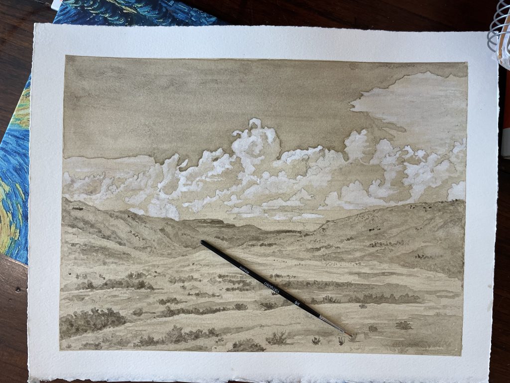 The landscape is getting there… just adding details in the shrubs, hillsides and need to wash the skies now with some broad strokes.