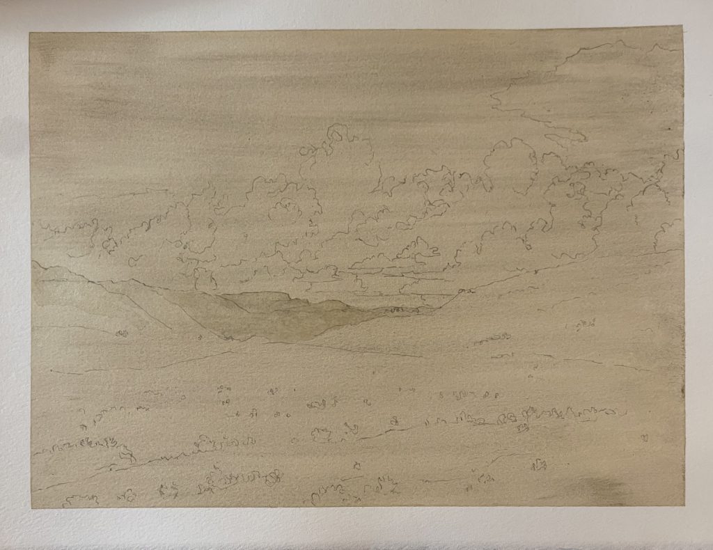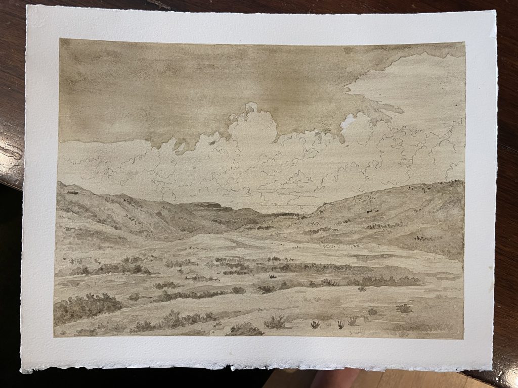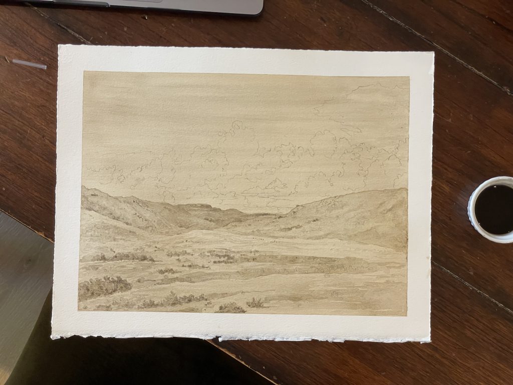 Just getting started with the oak gall ink now, laying in a light wash in the hills… I’ve found that you can add about three layers of ink, but after that it starts behaving strangely – it leaves what I would call an efflorescence around the edges of the darker patches of ink, which doesn’t look nice. I think it is related to the gum arabic in the ink that I add that is meant to give the ink some sheen, but I think that glossy effect seals out later layers and the ink… bugs out… anyway – slow and intentional ink layers now ahead of me.