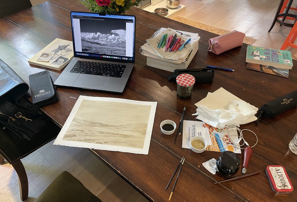 Wrapped up on the ink drawing of the Utah landscape, circa 2024. The ink tones are grey when they go on, but they mellow to a caramel brown over time, which I just love.