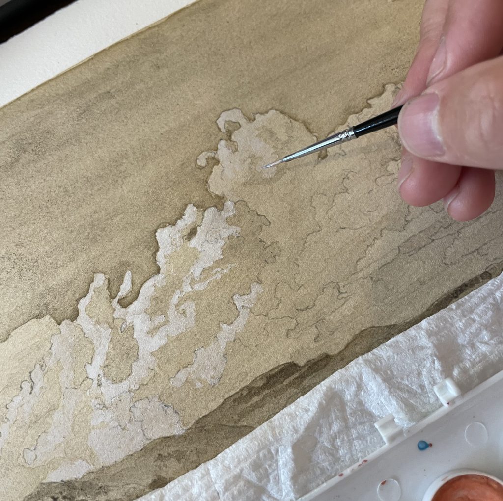 I’m adding the white watercolor to the clouds now, something I’ve never done to an ink drawing… I was really pleased with the way the paint laid out on the paper; felt natural and complemented the oak gall ink.