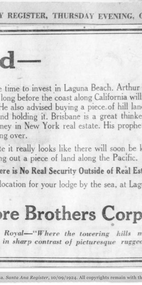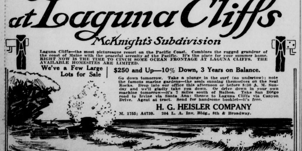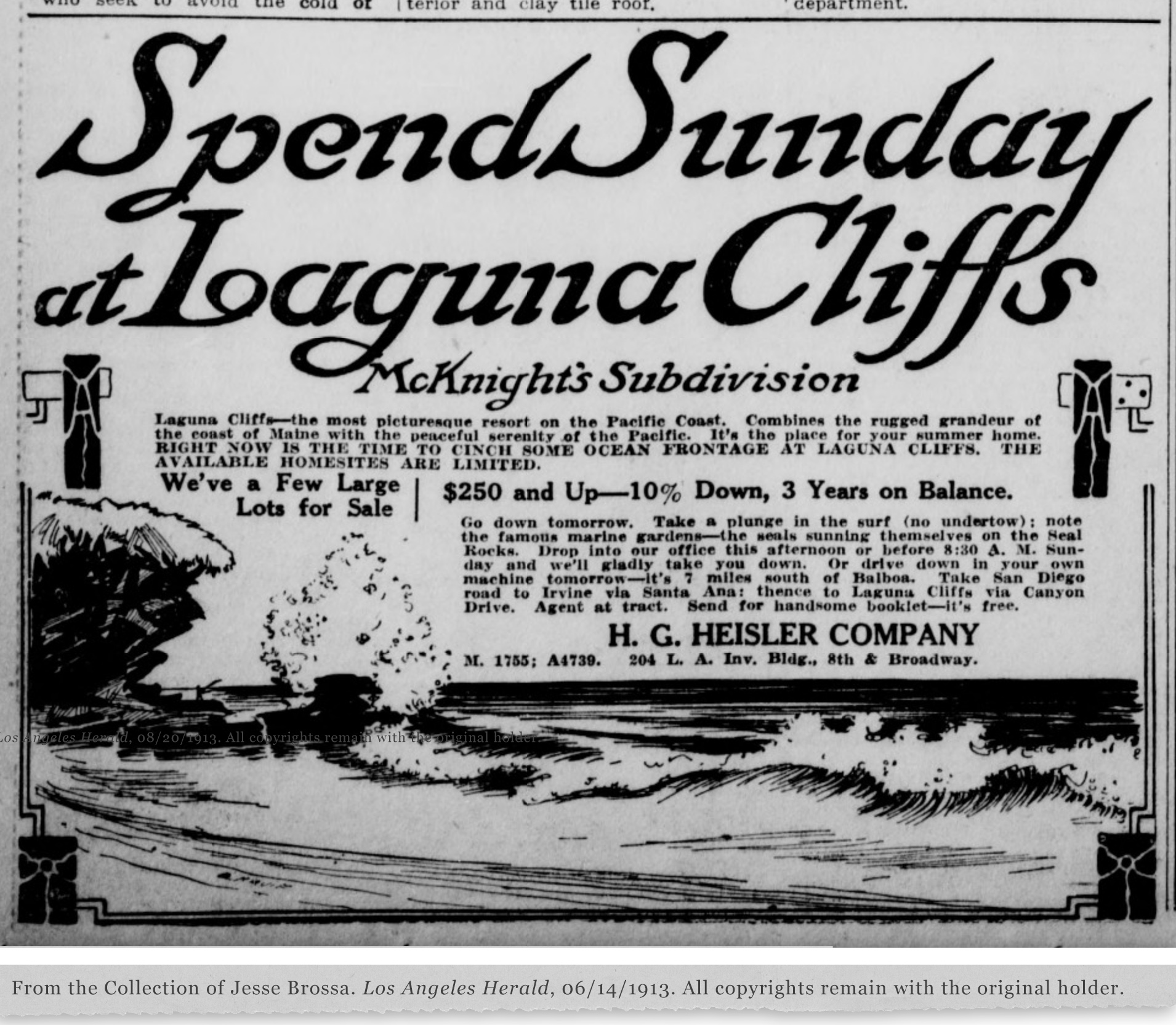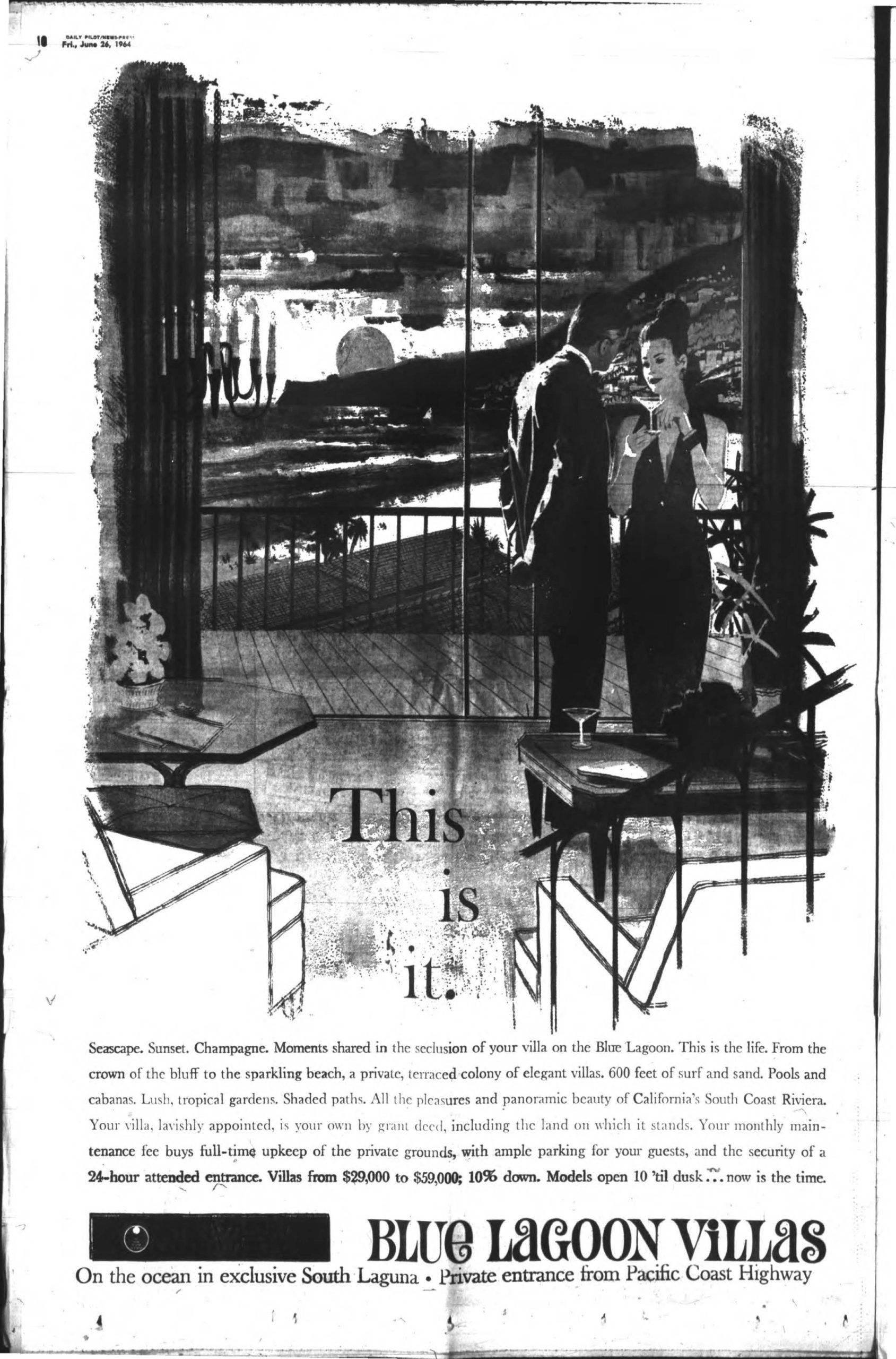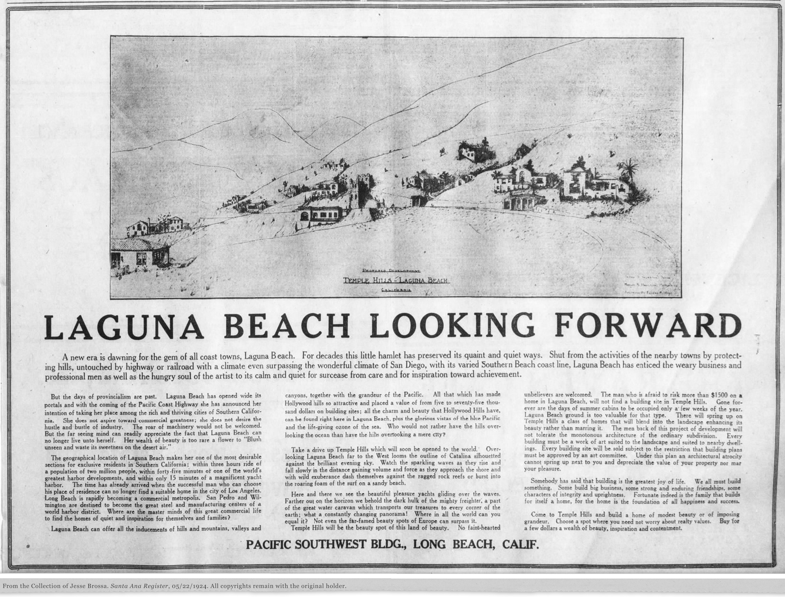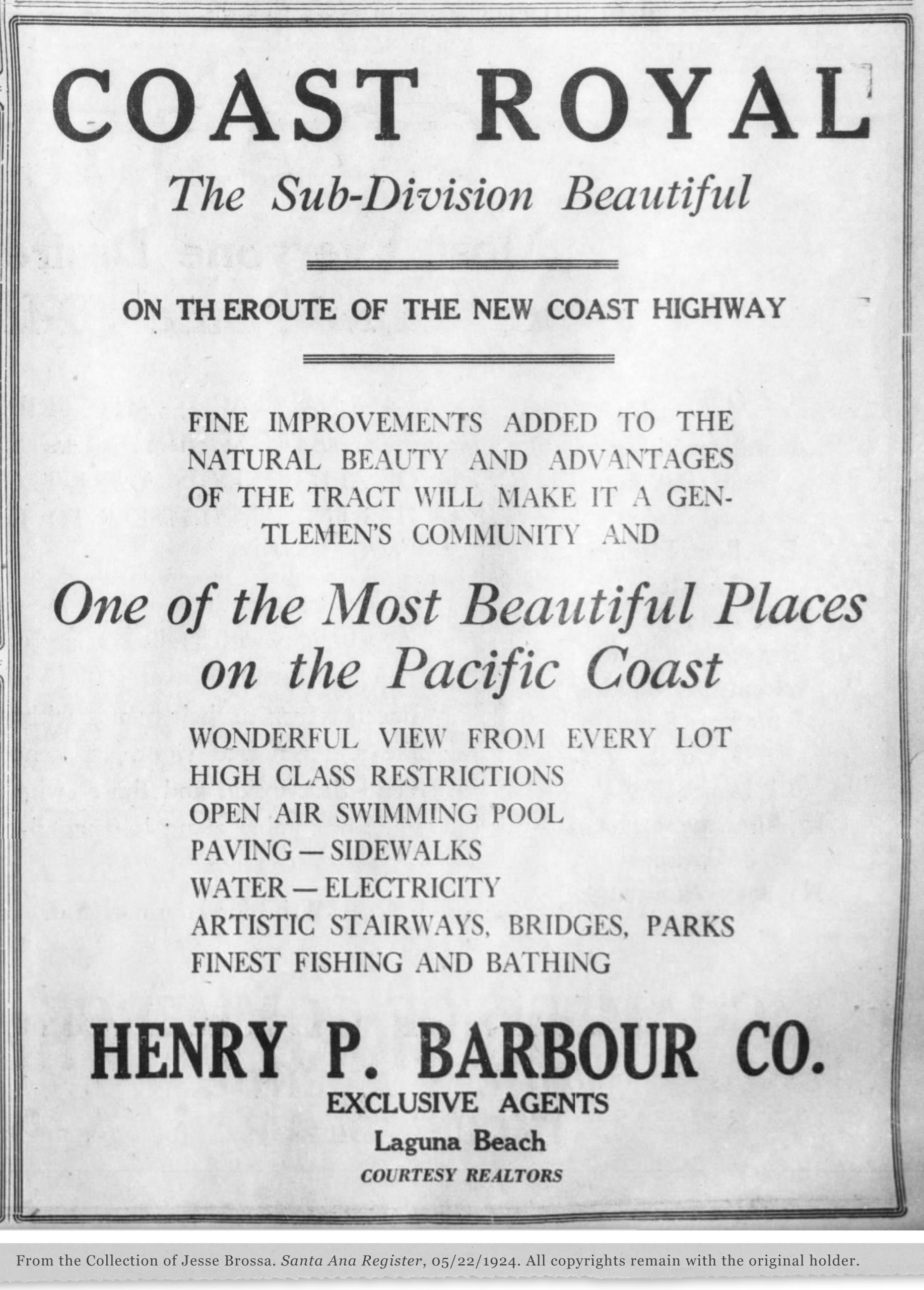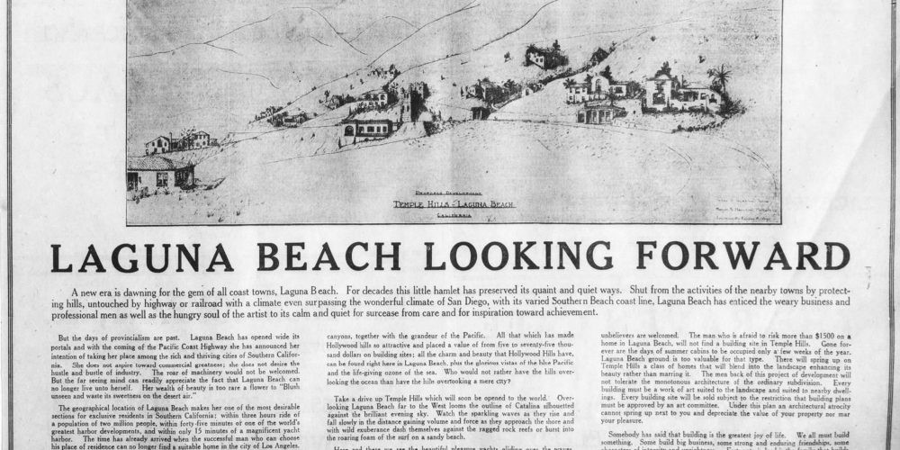 “The geographical location of Laguna Beach makes her one of the most desirable sections for exclusive residents in Southern California; within three hours ride of a population of two million people (Los Angeles; within 45 minutes of on the the world’s greatest harbor developments (Newport Beach) and within only 15 minutes of a magnificent yacht harbor (Dana Point).”