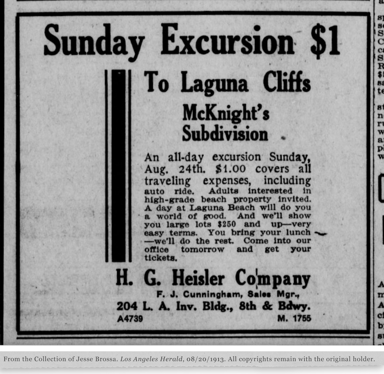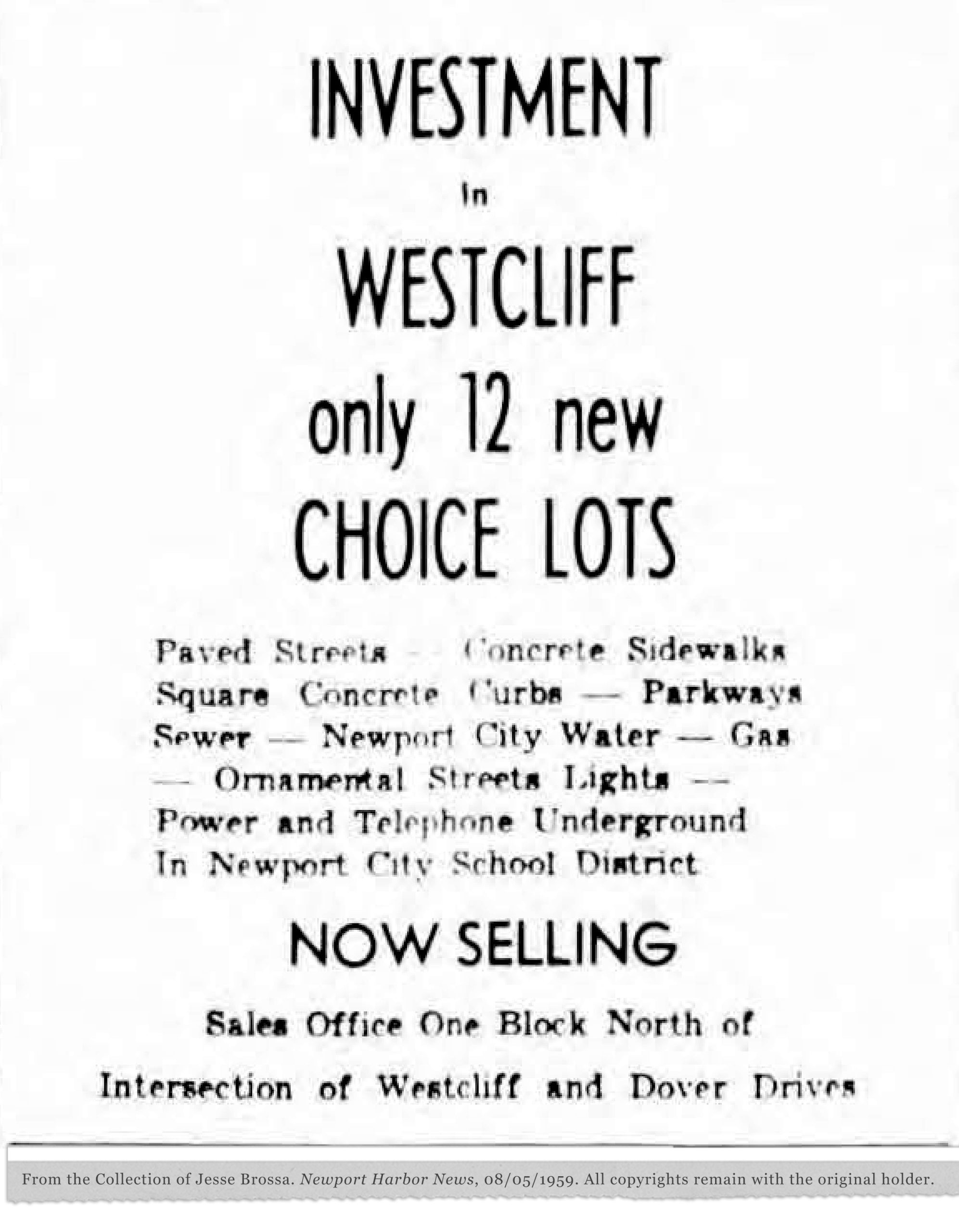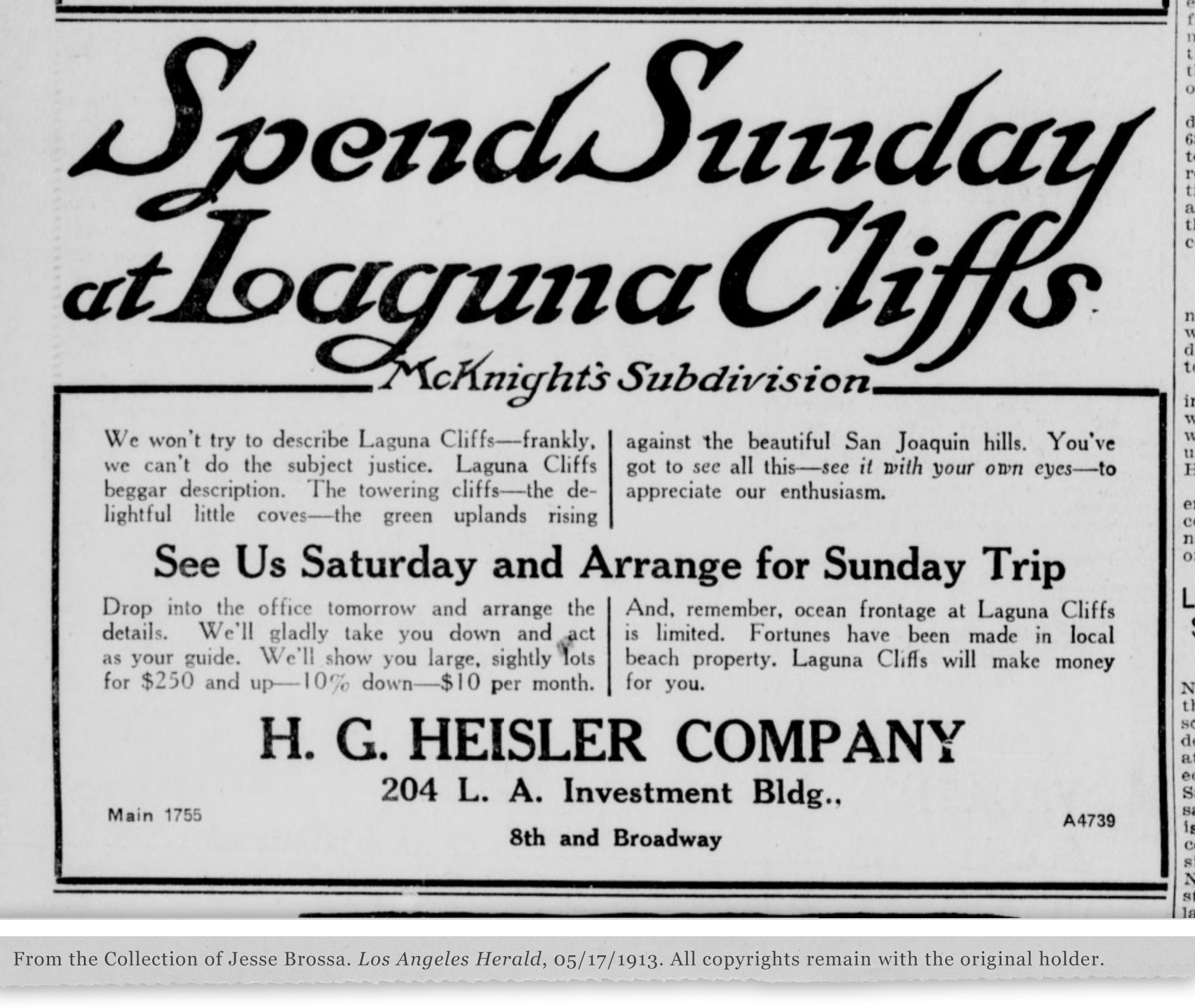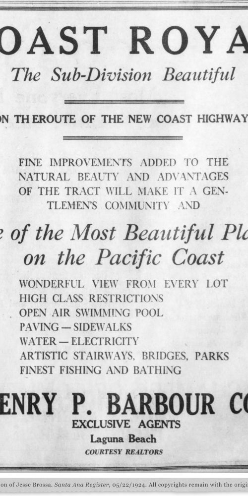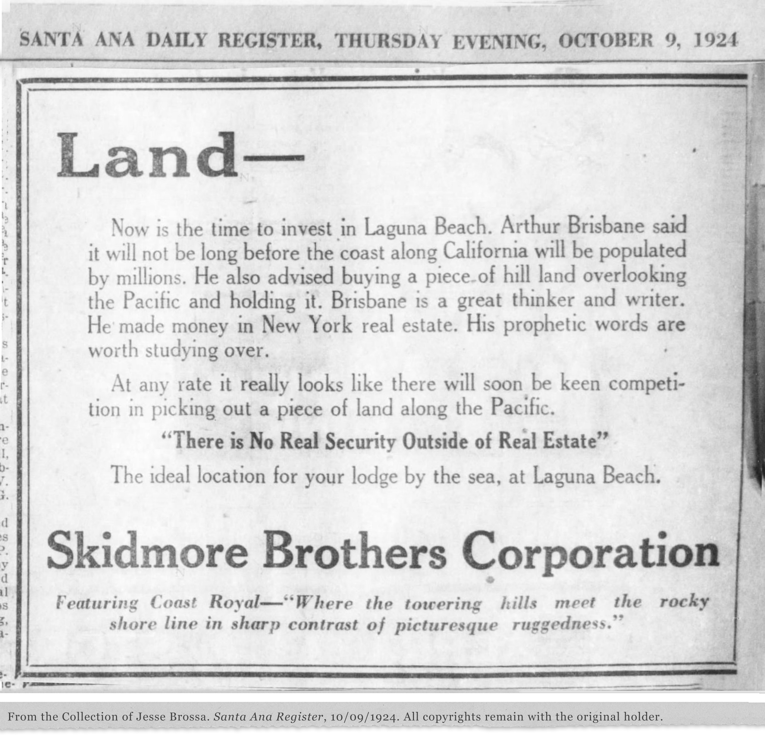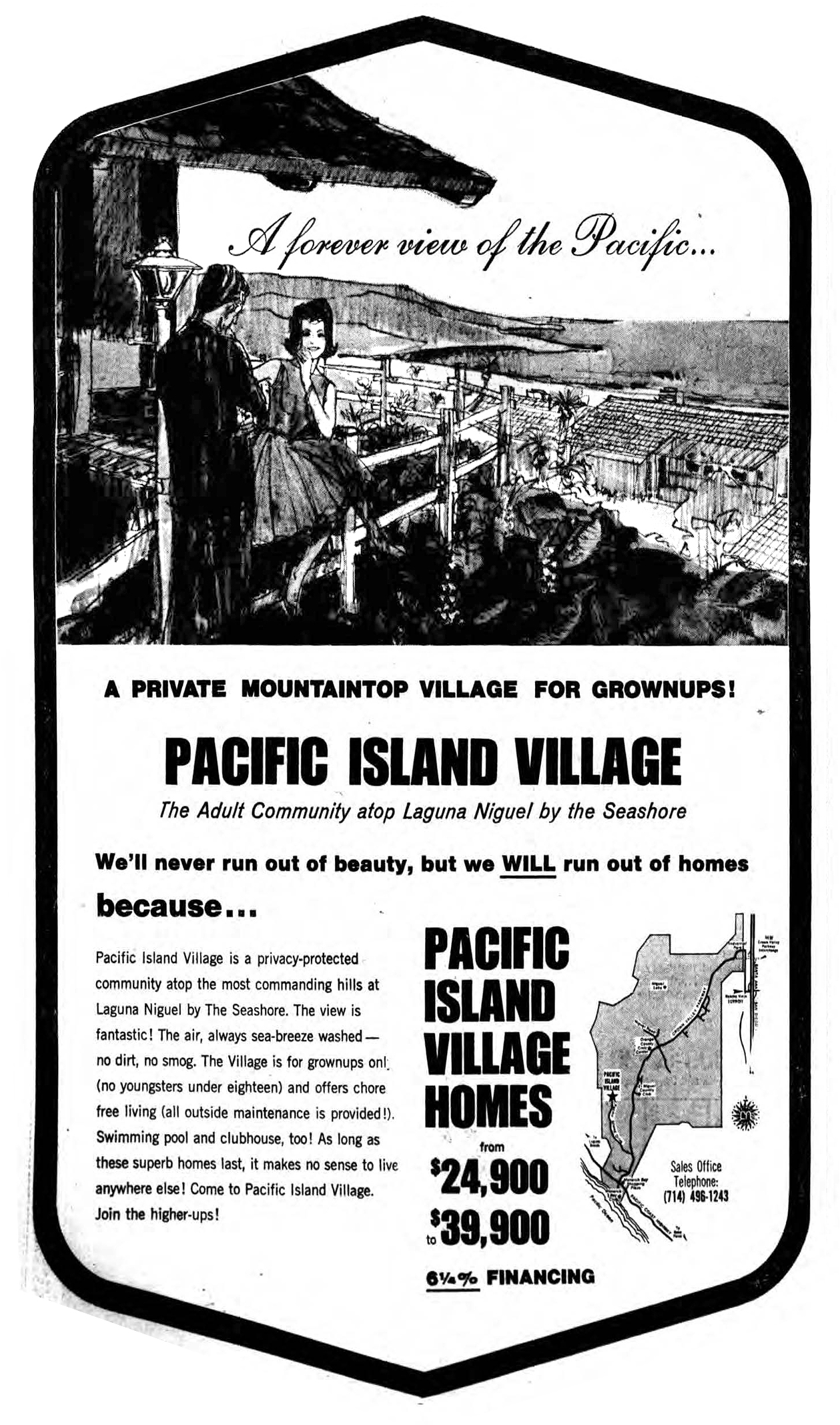 “The geographical location of Laguna Beach makes her one of the most desirable sections for exclusive residents in Southern California; within three hours ride of a population of two million people (Los Angeles; within 45 minutes of on the the world’s greatest harbor developments (Newport Beach) and within only 15 minutes of a magnificent yacht harbor (Dana Point).”