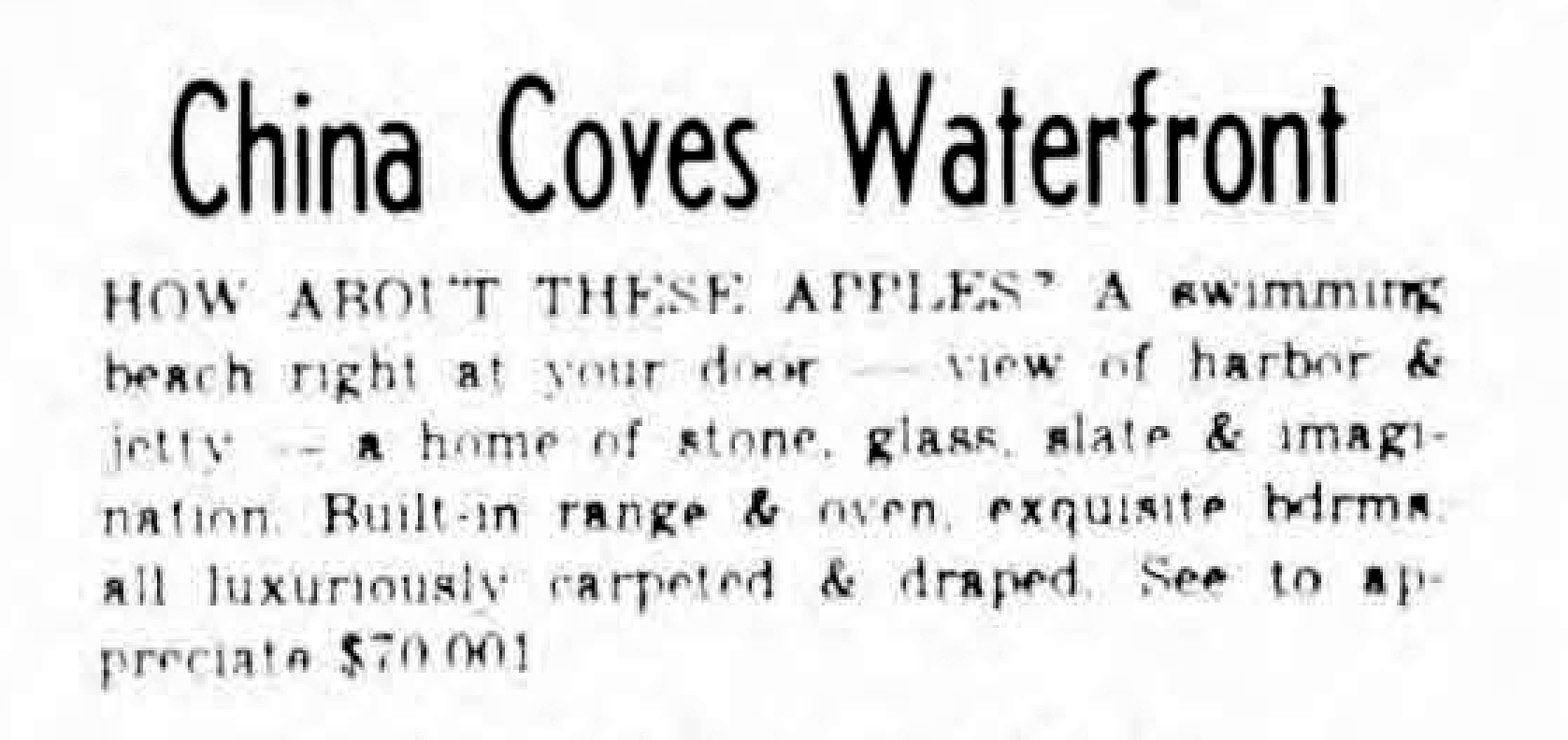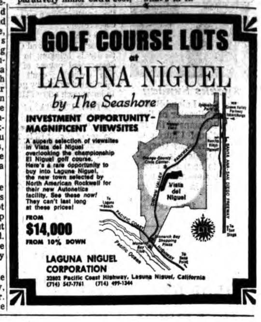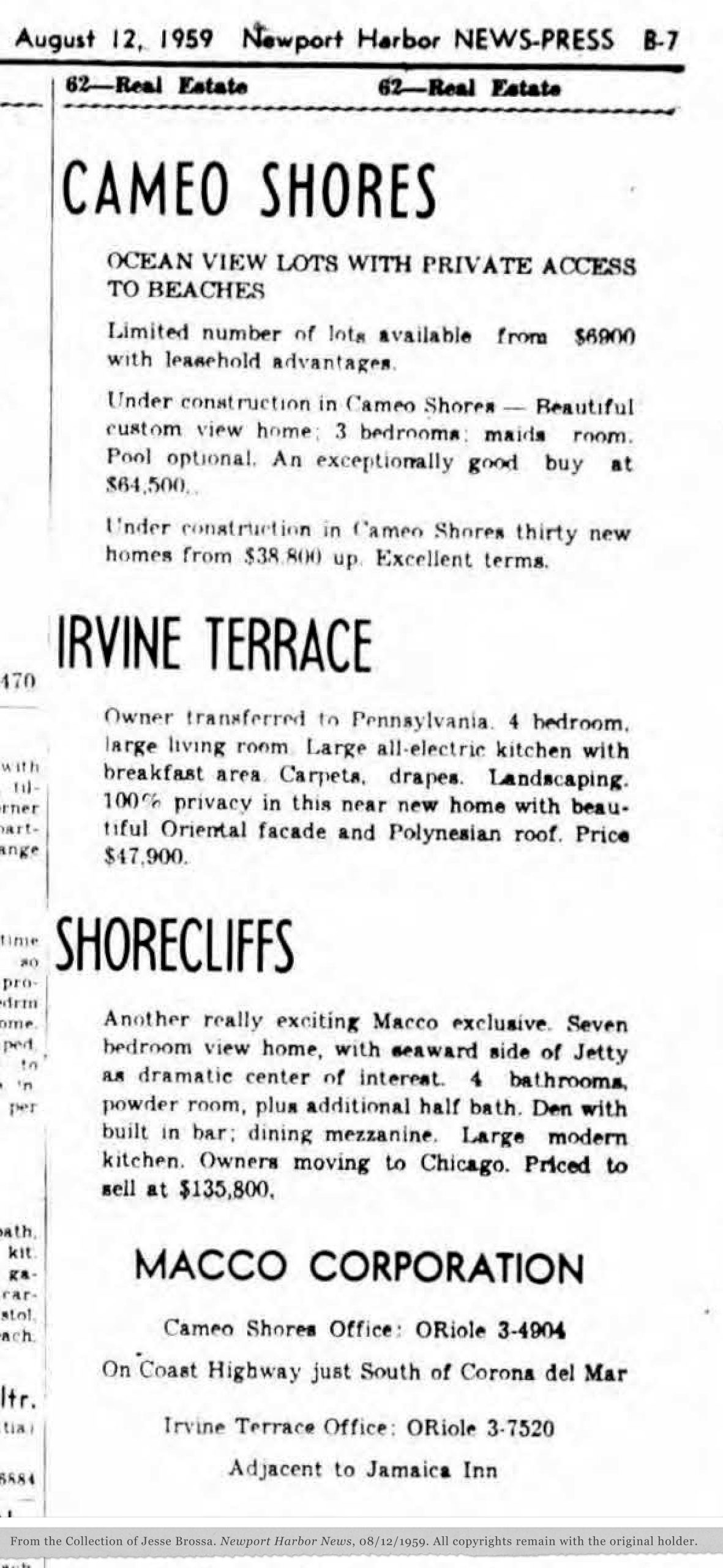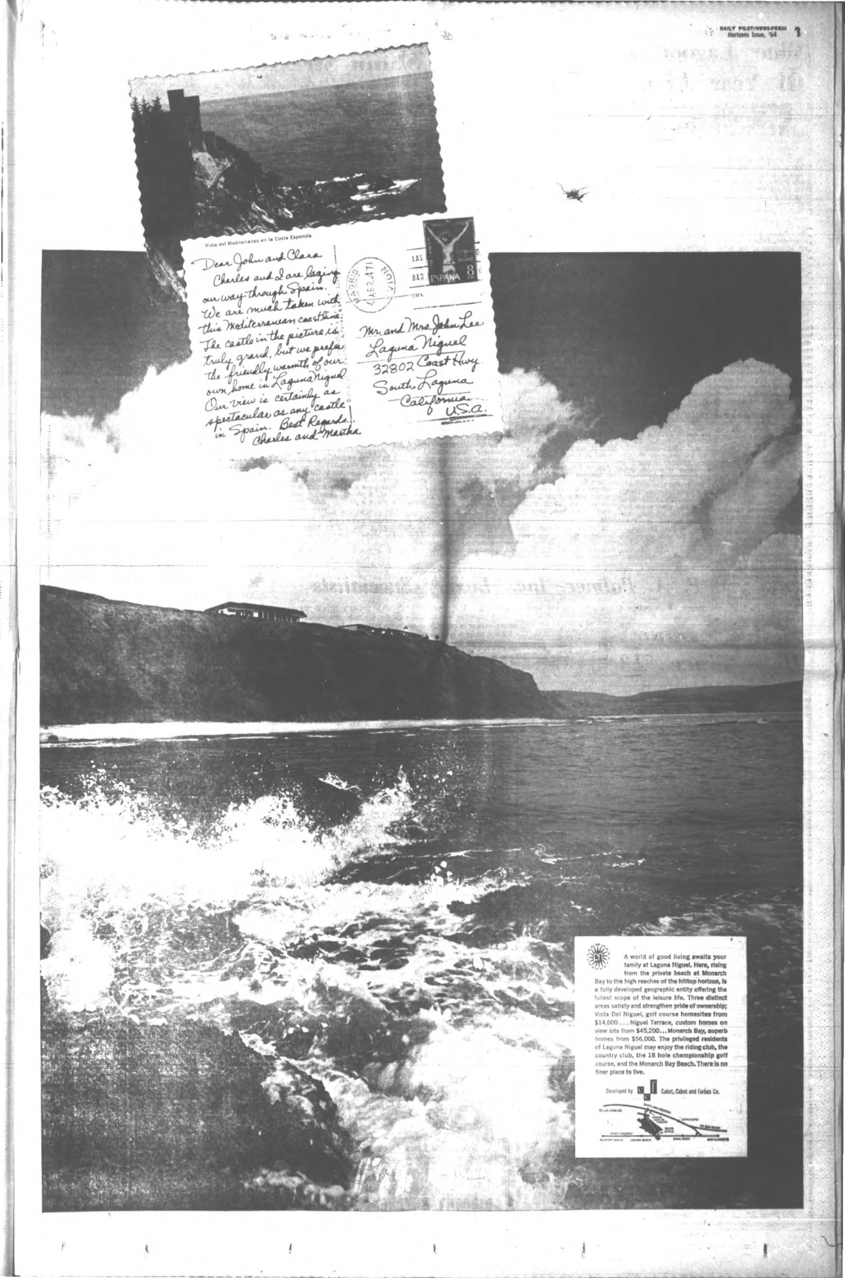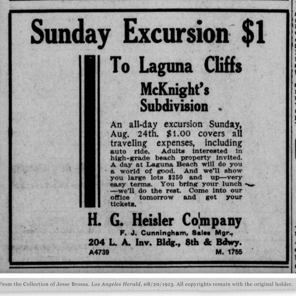 “The geographical location of Laguna Beach makes her one of the most desirable sections for exclusive residents in Southern California; within three hours ride of a population of two million people (Los Angeles; within 45 minutes of on the the world’s greatest harbor developments (Newport Beach) and within only 15 minutes of a magnificent yacht harbor (Dana Point).”