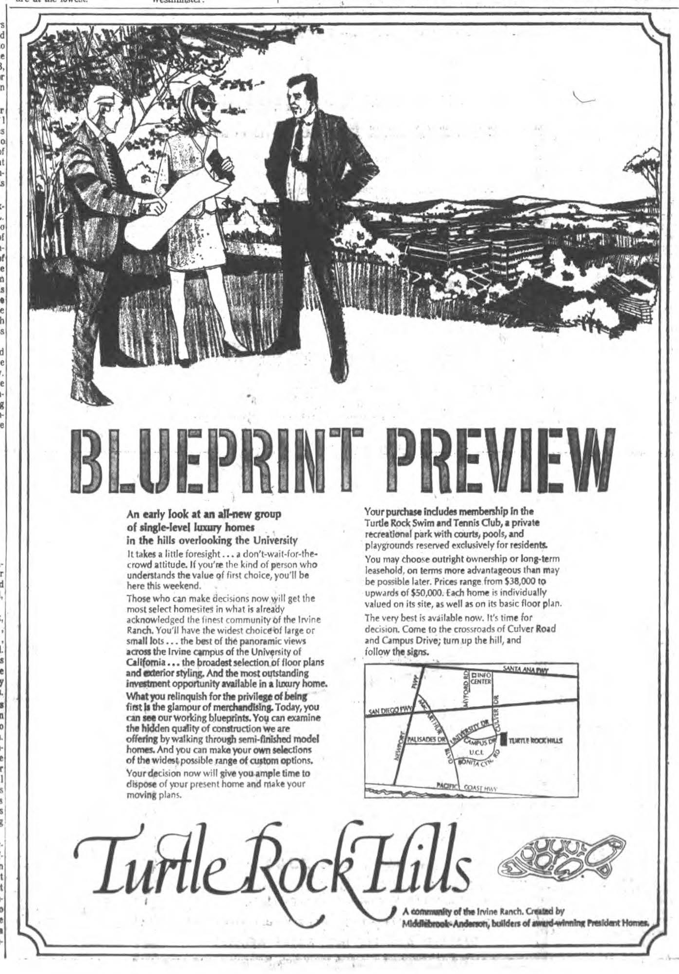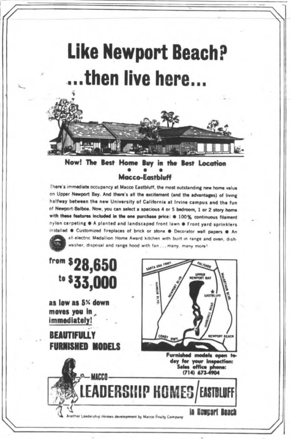 Real estate advertising in the 1970’s in Orange County followed the trends of years before – always selling the coastal-close destinations, but now with the cultural unrest of the Vietnam War and what was perceived to be radicalism with hippies and countercultural trends, an introduction of architectural styles that perhaps harkened back to an earlier age – European ideas – as well as the introduction of the Ranch-style home that referenced an early form of Californian home – single level living spread over a large lot.